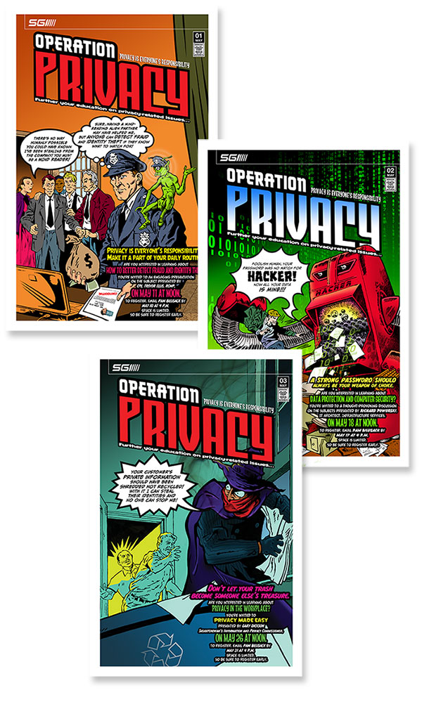 SGI’s Privacy Department needed to advertise instructional seminars which promoted the importance of working with private and sensitive information. I developed a series of posters based on a retro comic book style of illustration which featured topics being covered at each session.